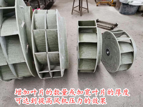 加大葉片的寬度、厚度以及調(diào)整葉片的弧度都可不同程度的提高風壓,如本公司生產(chǎn)的玻璃鋼高壓風機就是通過噶便葉輪的規(guī)格來達到使用標準。