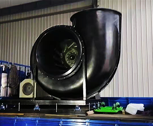 當玻璃鋼離心風機的型號超過10C時,因為風機的葉輪、外殼等配件的尺寸都偏大,所以需要將玻璃鋼材質的架子更換為碳鋼架子。最近有個江蘇的客戶從我司采購了一臺14C的風機,下面是該風機的安裝與發貨圖。