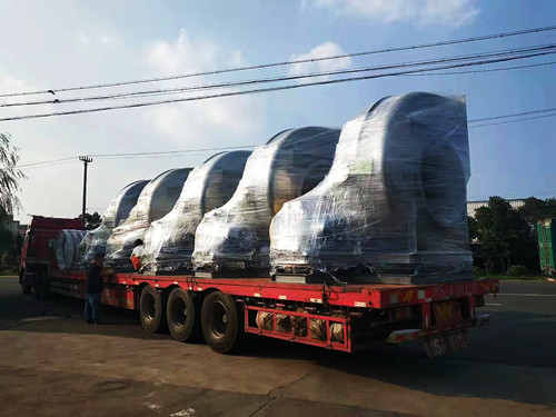 風機的整體尺寸會隨著型號的變大而增加,但是從運輸與安裝的角度考慮,一般最大型號的玻璃鋼離心風機高度極限為3米左右。這種型號的風機對應為14C,長度在2.5-3.5米左右,高度在3米左右。如果需要處理的風量比較大,可使用多臺風機搭配使用。下面是多臺大型號的玻璃鋼離心風機發貨圖。